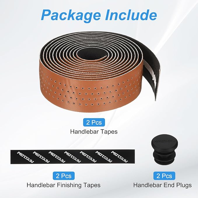 パッキングリスト: 1ペアのハンドルバーテープ、1ペアのハンドルバーエンドプラグ、1ペアのハンドルバー仕上げテープ。