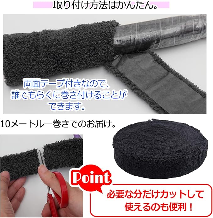 取り付け方法はかんたん。両面テープ付きなので、誰でもらくに巻き付けることができます。10メートル一巻きでのお届け。必要な分だけカットして使えるのも便利!