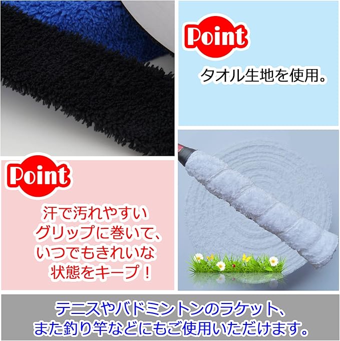 やや薄手のタオル生地を使用。汗で汚れやすいグリップに巻いて、いつでもきれいな状態をキープ!テニスやバドミントンのラケット、また釣り竿などにもご使用いただけます。
