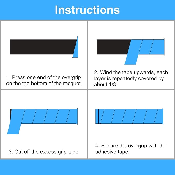 使用方法:1. グリップテープの一方の端をラケットの底の側面に押し付けます。2. テープを上に巻き、各層の端は約1/3ずつ重ねてカバーします。3. 余分なグリップテープを切り取り、付属の両面テープで上部を固定します。