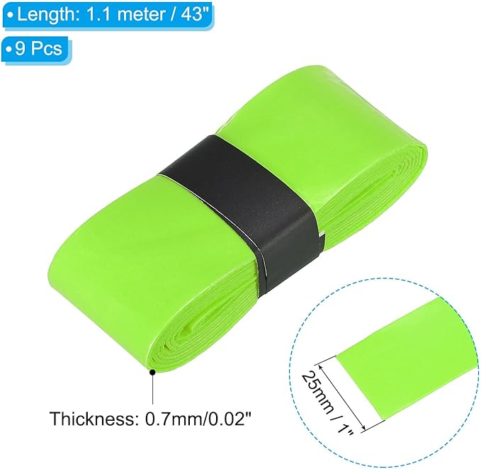 カラー:蛍光イエロー;素材:PU;サイズ:1.1メートル x 25mm / 43 x 1" (長さ 幅);パッキングリスト:ラケットグリップテープ 9本