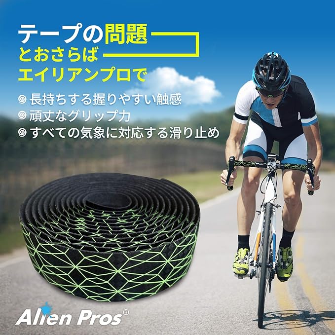 バイカーによるバイカーのための頑丈で信頼性の高いテープ - Alien Pros 自転車用炭素繊維ハンドルバーテープは、汗を吸収して耐久性があります。また、握りやすさが特徴です。