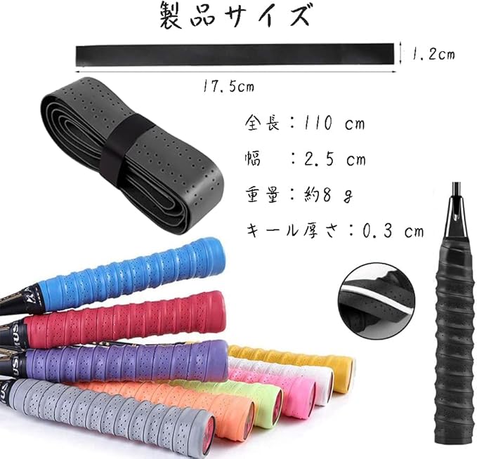【製品仕様】キールデザインなグリップテープ、10本入。長さ110cm*幅2.5cm厚さ*0.8cm キール厚さ0.3cm。グリップテープを調整することでラケットが握りやすくなるだけでなく、耐久性のアップにもつながります。素材はPUで手へのフィット感が強いので、握力が弱い人でもしっかり握れます。