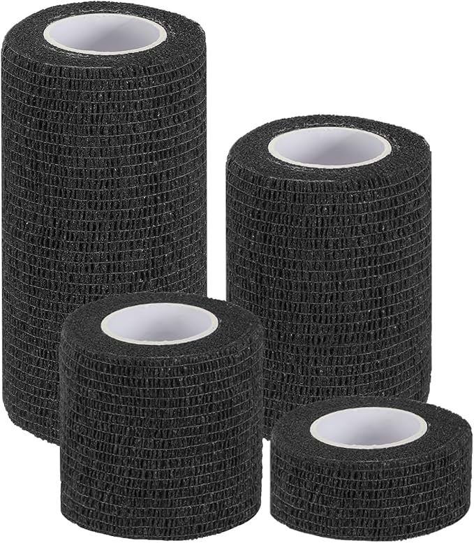 カラー:黒;素材:不織布;長さ:177"(450 cm);4つの幅:1"(2.5 cm)、2"(5 cm)、3"(7.5 cm)、4"(10 cm);梱包リスト:セルフアドヘーシブバンデージラップ4個(仕様ごとに1個)