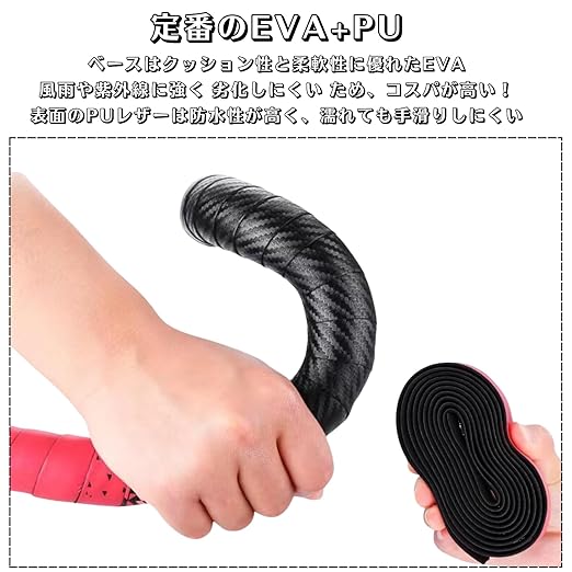【高い耐久性】EVA素材の使用により、風雨や紫外線に強く劣化しにくいバーテープです。表面のPU素材は防水性が高く、手のひらの汗や雨に濡れても快適な運転を維持。耐久性が高いため、メンテナンスの手間やコストを抑えられ、長期間使用できるコストパフォーマンスに優れた商品です。自転車愛好家の方々に、安心して長くお使いいただけます。