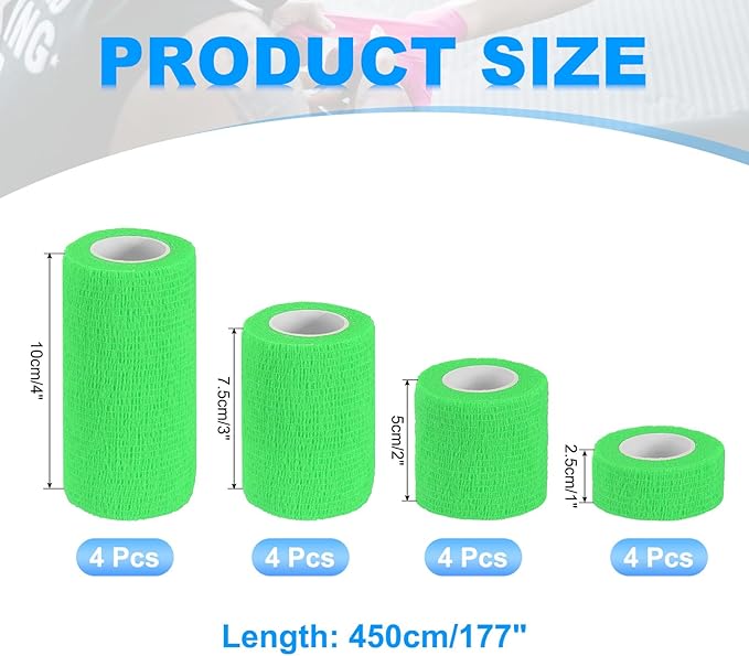 カラー:明るい緑;素材:不織布;長さ:177"(450 cm);4つの幅:1"(2.5 cm)、2"(5 cm)、3"(7.5 cm)、4"(10 cm);梱包リスト:16個 x セルフアドヘーシブバンデージラップ(1個ごとの仕様)