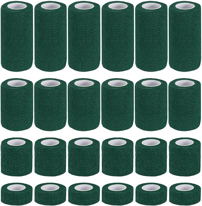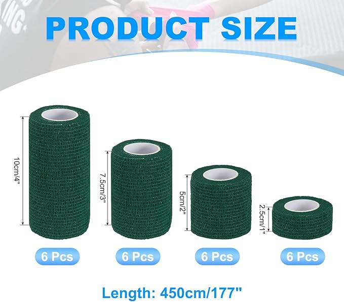 カラー:ダーク緑;素材:不織布;長さ:177"(450 cm);4つの幅:1"(2.5 cm)、2"(5 cm)、3"(7.5 cm)、4"(10 cm);梱包リスト:セルフアドヘーシブバンデージラップ24個(1個ごとの仕様)