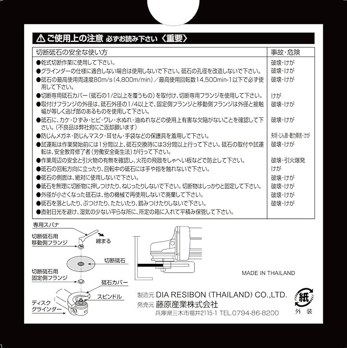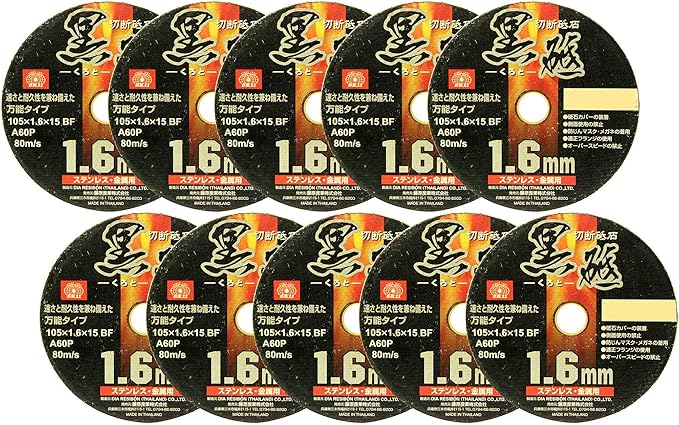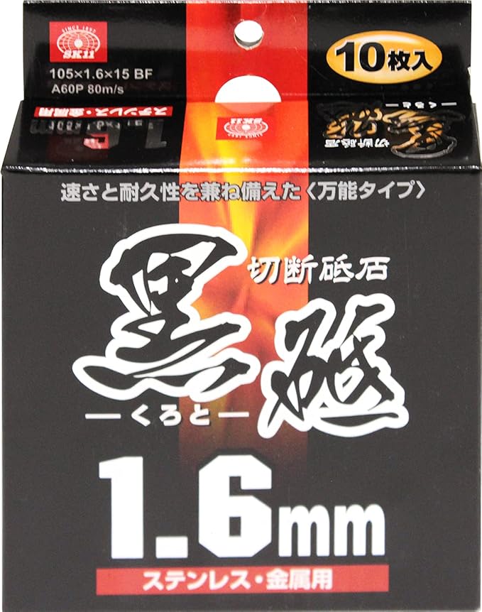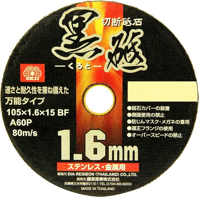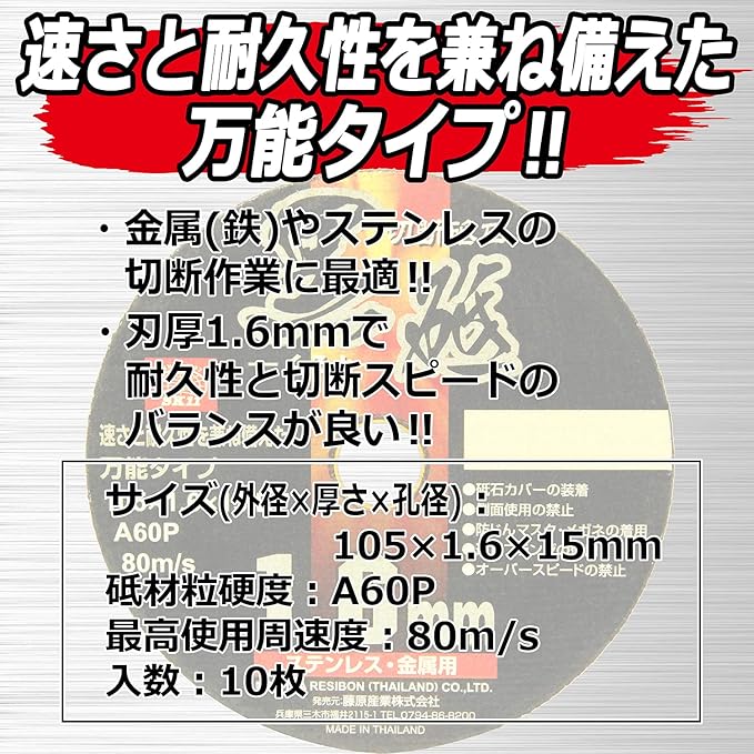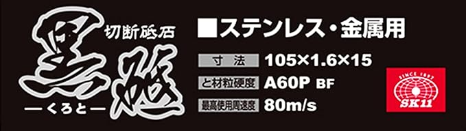 【特長】 ●金属(鉄)・ステンレスの切断作業。 ●1.6mm厚で耐久性・スピードのバランスがいい。 【仕様】 ●外径:105mm ●厚さ:1.6mm ●孔径:15mm ●と材粒硬度:A60P ●最高使用周速度:80m/s ※砥石カバーを装着してください防じんマスク・保護メガネを着用してください ※適正ブランジを使用してください砥石側面使用はおやめ下さい