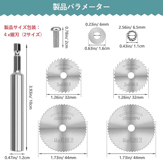 【注意事項】1.使用する際は、必ず手袋とゴーグルを着用し、周囲の火花に注意してください。2.このスリッターブレードを使う時は回転速度が遅くなって、ロッドを最後まで持たねばなりません。鋸刃の最大速度は20000 rpmを超えてはならない。
