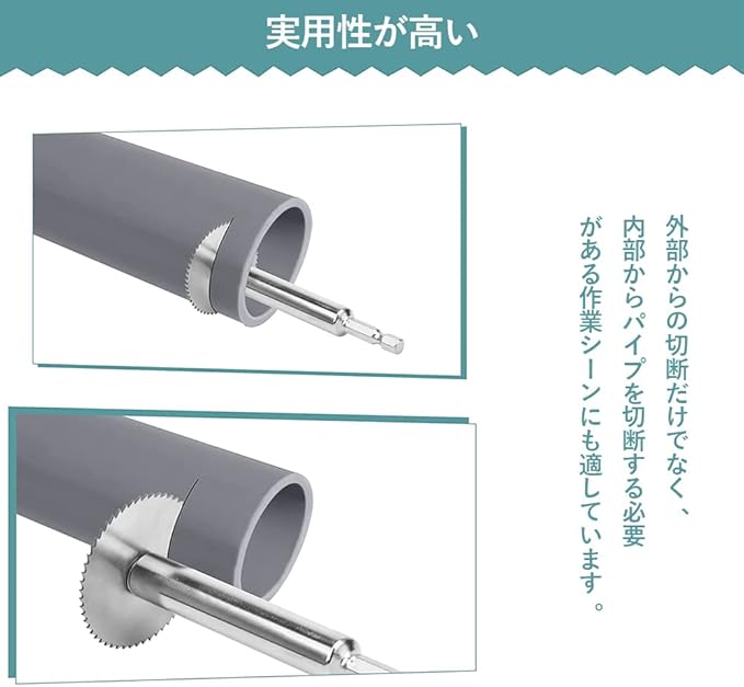 【実用性が高い】回転パワーがあり、歯ギャがつよい、刃が流暢切粉で素早くカットし、カッターはほとんどのドリルに適しており、小型で持ち運びしやすく、取り付けと交換が容易です。外部からの切断だけでなく、内部からパイプを切断する必要がある作業シーンにも適しています。