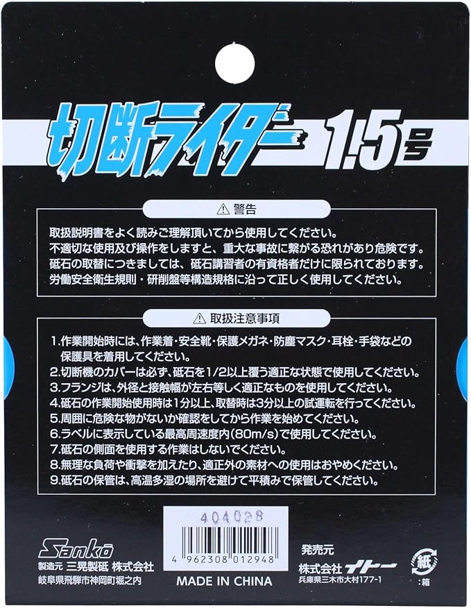 ・切断機のカバーは必ず砥石を1/2以上覆う適正な状態で使用してください。フランジは、外径と接触幅が左右等しく適正な物を使用してください。砥石の作業開始使用時は1分以上、取り換えは3分以上の試運転を行ってください。最高周速度内で使用してください。