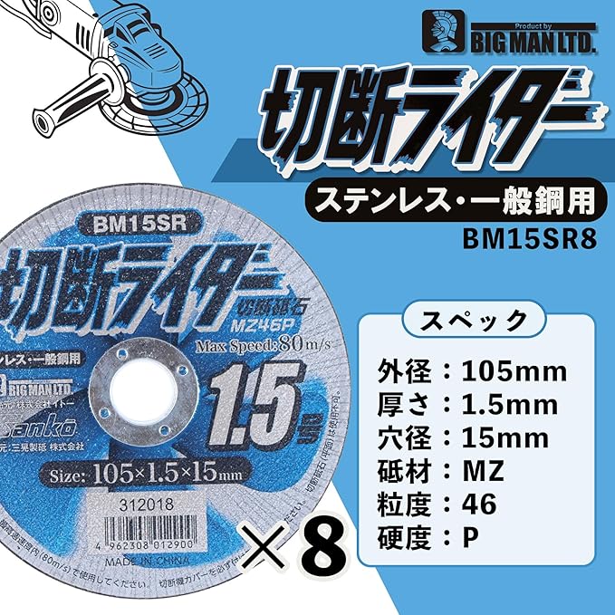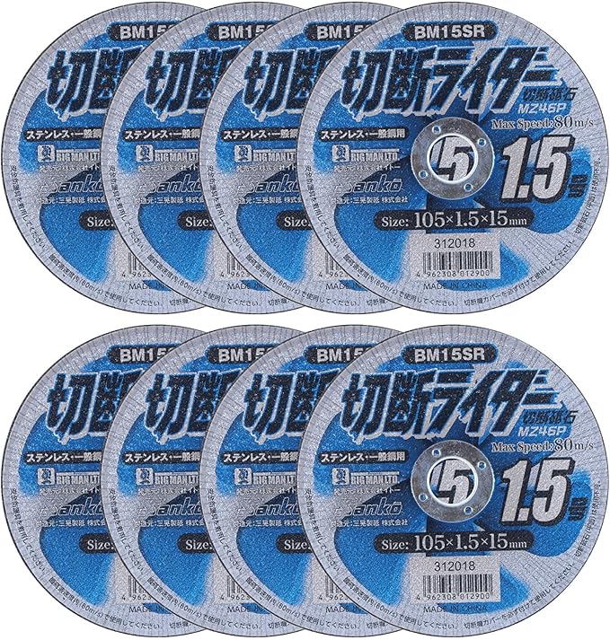 ・外径:105mm ・厚さ:1.5mm ・穴径:15mm ・砥材:MZ ・粒度:46 ・硬度:P ・最高周速度:80m/s ・最高使用回転数:14558min-1
