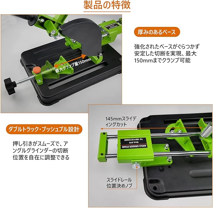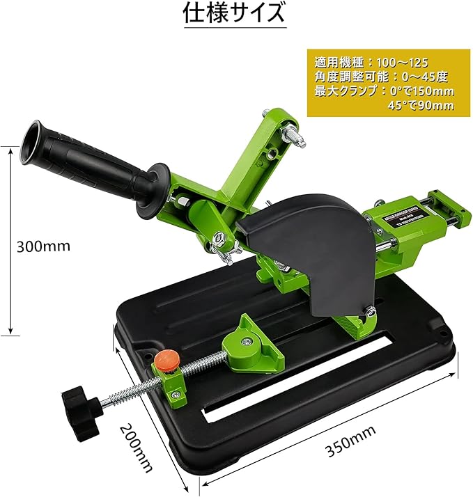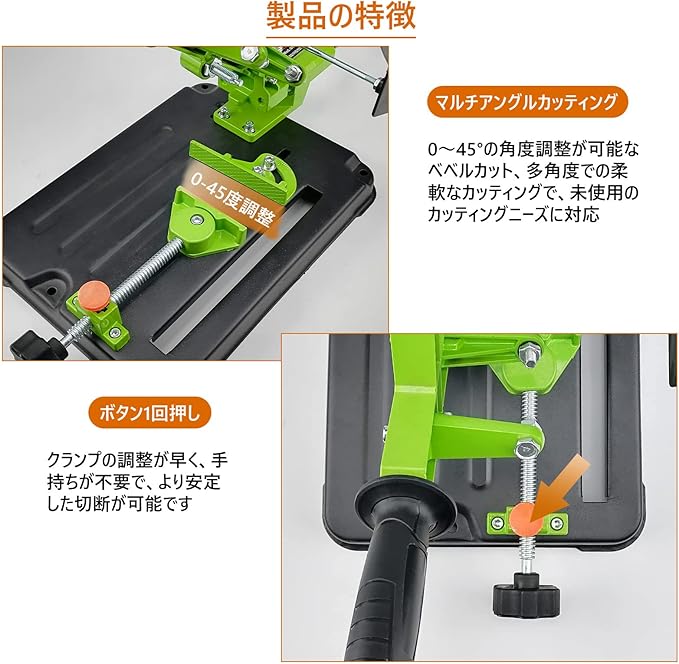 【45度クランプ】:調整可能なクランプを使用すると、切断角度を簡単に調整できます。クイッククランプのスイングは0度から45度です。最大クランプ角度は45度で、クランプ幅は80mmです;0度で,最大クランプ幅は150mmです。