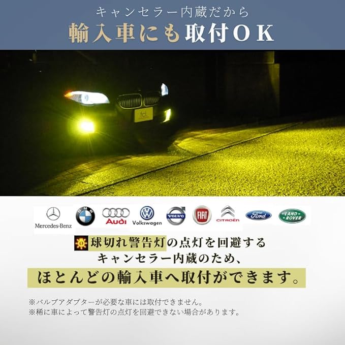 【本製品のご注意点】・バルブアダプターが必要な車種へのお取り付けはできません。・極性がございますので、点灯しない場合は逆向きにお差し込みください。・フィン部分は高温になりますため、配線やタイラップが接触しないよう、また排熱・ファン干渉にご注意ください。・純正ヒューズが15A未満の場合、15Aヒューズへの交換または別売リレーハーネスのご使用を推奨いたします。ヒューズ切れの恐れがございます。・H1、H3など、裏蓋防水カバーの加工が必要な場合がございます。・ライムイエローは車検基準内ですが、検査官の判断により非対応となる場合もございます。・防水ゴムは稀に破損することがございます。その際は付属の予備ゴムに交換してください(ご購入時期によっては付属しない場合もございます)。・輸入車では、球切れ警告灯の回避やヒューズ切れ防止のため、別売リレーハーネスやキャンセラーが必要な場合がございます。エンジン始動時等の一時点滅は車両仕様によるものです。