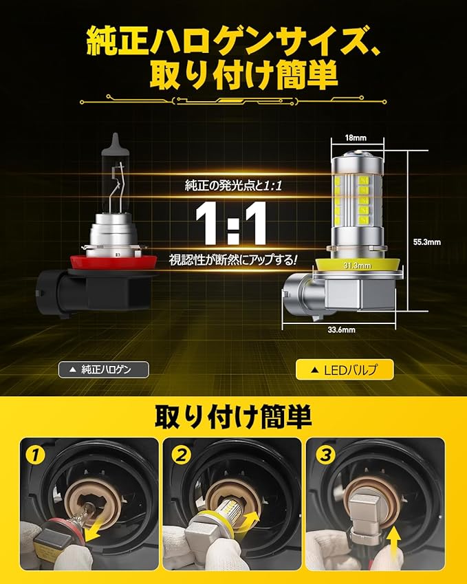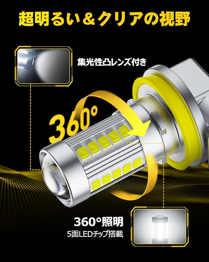 【配光が抜群h11フォグランプ】ハロゲンバルブを忠実にLEDで再現し、正確な配光を実現している為、対向車に迷惑をかけません。集光性の凸レンズ付き、光がより広く、遠くまで届きます。LEDチップ全面から360 均一に発光することで、視認性の高い夜間の安全運転に配慮しております。激しい雨や霧など視界が悪いときの視認性を向上させます。