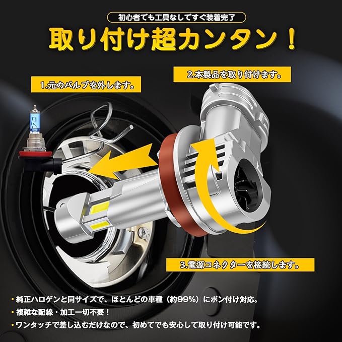 【車検対応&正確配光 – 対向車への眩惑を防止】純正ハロゲンバルブと同じ位置に発光点を配置することで、美しいカットラインと正確な配光パターンを実現。夜間や悪天候でも路面をくっきり照らし、対向車や歩行者を眩惑させずに安全に走行可能です。