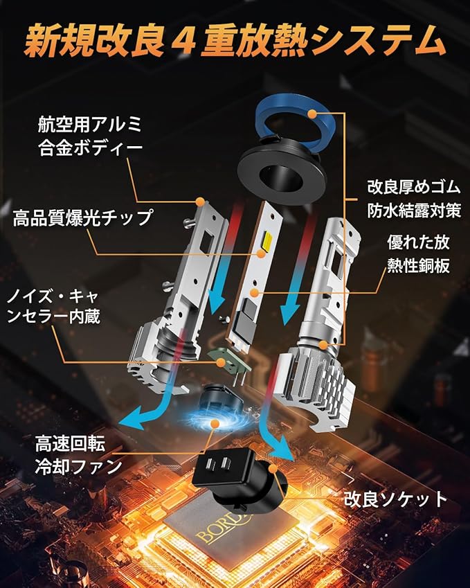 【放熱性抜群&結露対策】BORDAN H11 LED ヘッドライト本体部分は、強度と熱伝導性を両立した航空アルミニウム合金ボディを採用され、凹溝式設計で最大限度放熱面積を増やして、放熱性能を大幅に向上させ、長い寿命を実現します。さらに高速冷却ファン付き、放熱性と耐久性はより一層UP!そして、IP68防水レベルを取得すると同時に、気密性が高くなる防水リングも付き、雨と雪の日も安心!