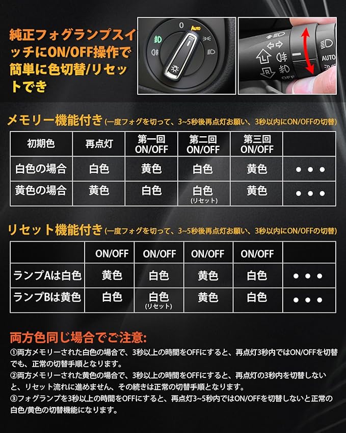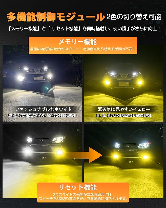 【2色切替&メモリー機能による操作超簡単】イエロー(3000K)/ホワイト(6500K) のh11 led フォグランプ 2色切り替えです。純正フォグランプスイッチで発光色を簡単に切り替えでき、天候に合わせて発光色を切り替えで、夜間・雨・霧など悪天候の安全運転を確保できます。また、メモリー機能とリセット機能付き、毎回面倒な切替要らず、スタート時はデフォルトは前回使用色であります。色違いの心配でも要らず、リセットの操作流れはスイッチのON/OFFを切替だけで操作超簡単です。具体的操作ステップは写真からご覧になってください。