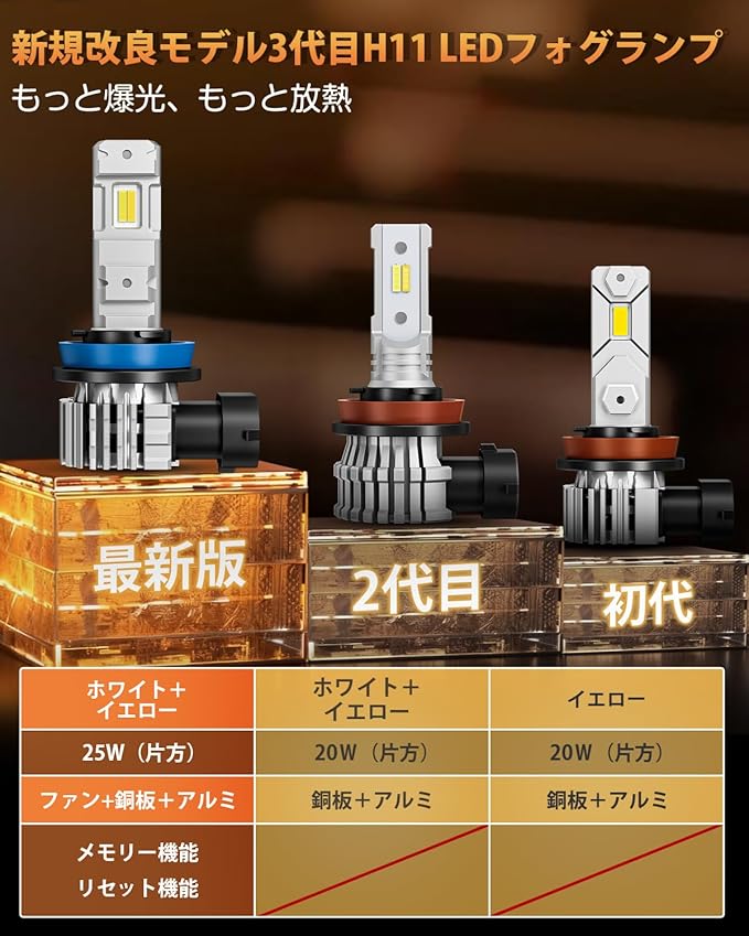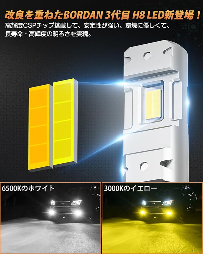 【改良を重ねた三代目H8 LED フォグ!】 高発光率の1860CSPチップ2枚を搭載、純正より安定性が一層強く、照射範囲も一層広くなるBORDAN H8 LED フォグランプはついに登場しました。一代目と二代目より、ハイパワーの25Wと高速冷却ファン付きに加えて、 メモリー機能とリセット機能も搭載しました!毎回面倒な切替要らず、スタート時はデフォルトは前回使用色であります。色違いの心配でも要らず、リセットの操作流れはスイッチのON/OFFを切替だけで操作超簡単です。LEDの劣化が早まることも防止します。放熱性と輝度はお大幅にUP!