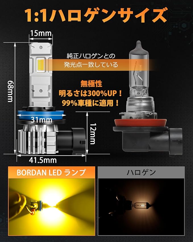 【安心1年保証】製品情報:h8 /h11/h16 led フォグランプ/色:3000kイエロー/6500Kホワイト/セット数:2個/電圧:DC12V。保証期間はご注文日より1年間です。使用中に万が一問題が発生した場合は、遠慮なく弊社までお問い合わせください。24時間内返答で、新品交換や返金などの解決策がご提供頂します、取付でもサポートできます。お問い合わせ時はAmazonのご注文番号をお伝えいただくとスムーズです。「BORDAN(ボルダン) カー用品専門店」-「質問する」の手順でクリックしてお問い合わせください。パッケージ内容:H8 LEDバルブ*2、日本語説明書*1、保障カード*1。