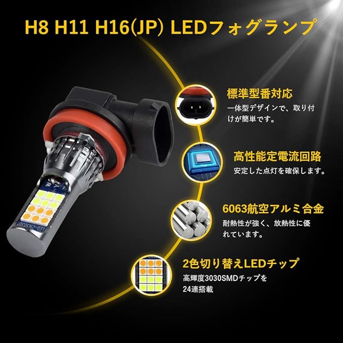LEDフォグランプ H8 H11 H16 LED 黄色 白 2色切り替え フォグ バルブ イエロー 3000K ホワイト 6000K 2色 フォグ球 LEDバルブ ファンレス 一体型 12V 車用 LEDライト 2個入 | KAZESHOP
