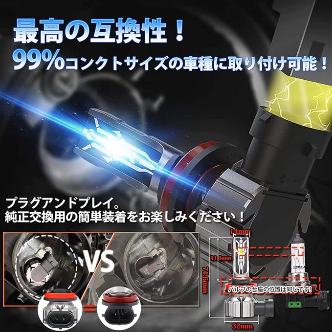 車用 LED フォグランプ H8 H11 LEDバルブ 新車検対応 ハロゲンサイズ型 6500K ホワイト CSPチップ搭載 H9 H16 バルブ 兼用 12V車用 LEDヘッドライト兼用 ファンレス ノイズ対策 2個入 | KAZESHOP