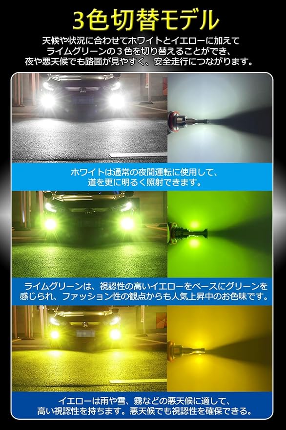 3色発光切替式:純正交換だけでカラフルチェンジ!個性のあるフォグランプに変装のは超簡単。3色の発光、天候に合わせて色温度が切替えできます。普段はホワイトでかっこよく、雨や雪なとの悪天候はイエローで視認性バツグン、気分転換時はスペシャルなライムグリーン。フォグランプのON/OFFだけで色を切り替えます。色切り替え順番:ホワイト→イエロー→ライムグリーン。
