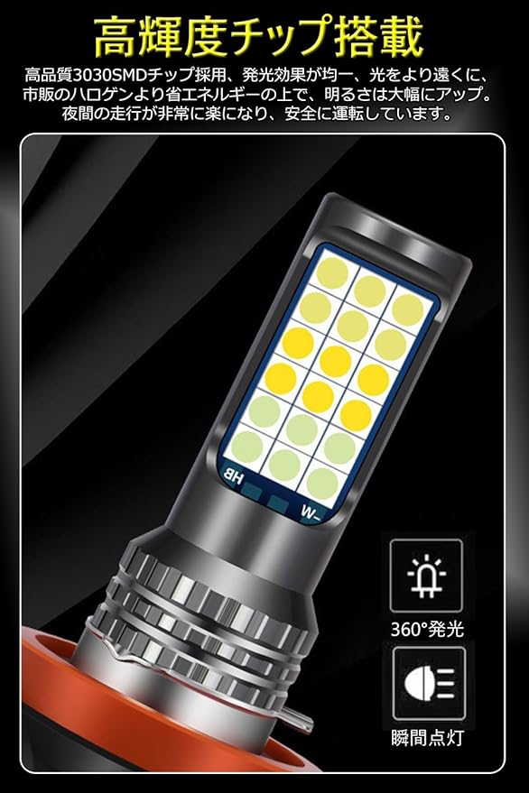 超高発光効率チップ:この H8/H9/H11/H16 led フォグランプは高品質 3030 LEDチップ採用、発光効率が大部アップ!両面チップ、均一で、高効率の発光を持って、明るさと安定性を大幅に向上させることで、視認性の高い、通常のハロゲンバルブより大きな贯通力を持つ、雨や霧、雪などの悪天候にしても良い視野を提供します。