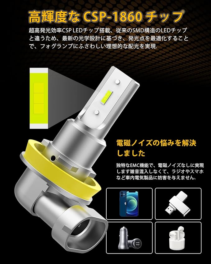 ★【高品質CSP1860SMD LED素子】純正発光を実現するヘッドライト!高品質 CSP LEDチップ採用、発光効率が大部アップ!ルーメン度が2000LM。抜群な明るさ、レモンイエローな色と360 光線角度で、視野範囲最大限に増やせます。