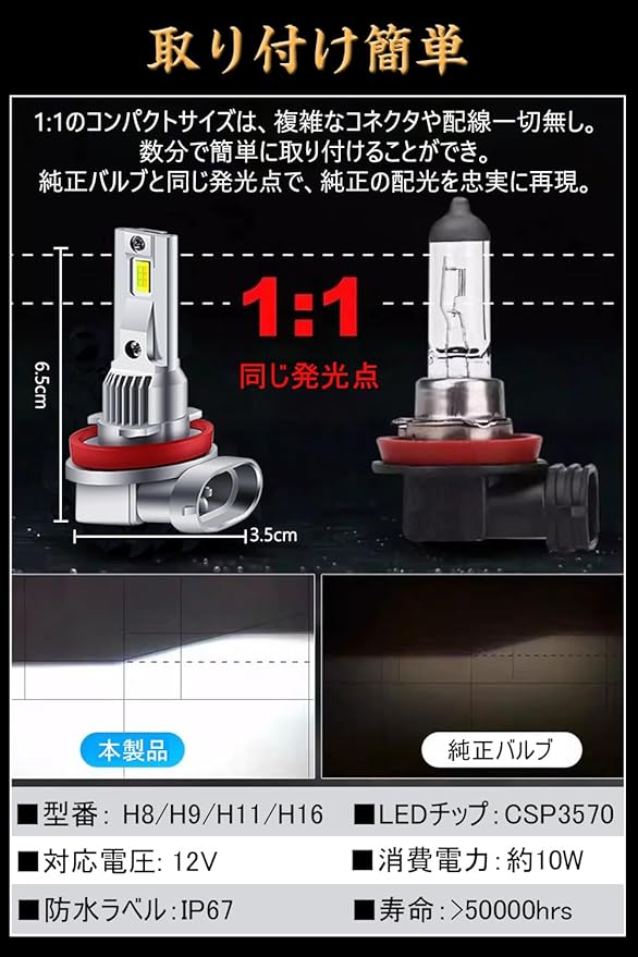 安全性高い、性能安定:この h11 led フォグランプ は高性能定電流ICドライバー搭載。EMC機能内蔵、点滅しない、FMは干渉しない。大部分車種はエラーフリー!(ご注意: ほとんどの車種で取り付け可能ですが、稀にバルブ裏の狭い車種等では取り付けできない場合がございます。念のため購入前に商品サイズをご確認ください。)
