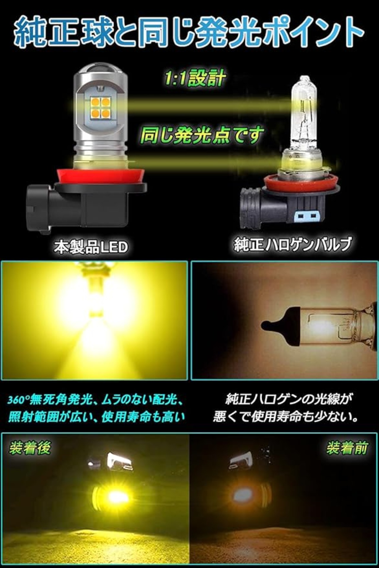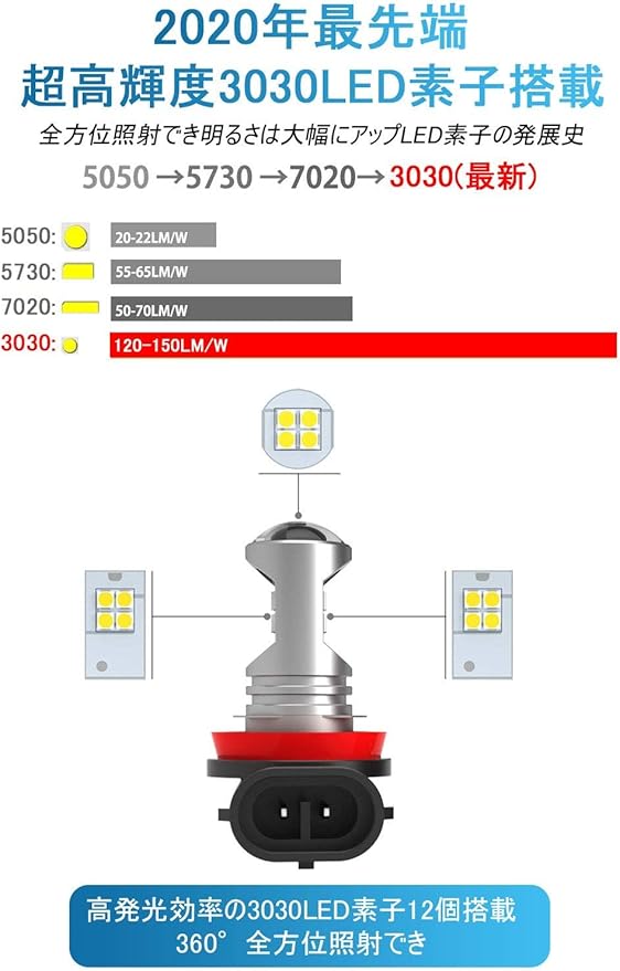超高輝度 全方位照射:このh11 ledフォグランプ超高発光効率の3030SMD LED素子12連搭載。上部は4連、周りは8連、拡散レンズ付きで光線を集中でき、照射距離を増やせる、本気の360 全方位照射でき。市販のハロゲンより省エネルギーの上で、明るさは大幅にアップ!
