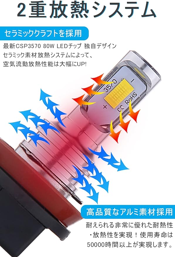 ➋強力な放熱効果&耐久性抜群:このH11 H8/H9/H11/H16 led フォグランプは航空用アルミ合金材質を採用、放熱効果が抜群で、LED素子の耐久性もアップでき、50000時間以上使用できます。長時間点灯しても耐えられ、安定した発光が可能です。雨の中でも安全に運転出来ます。