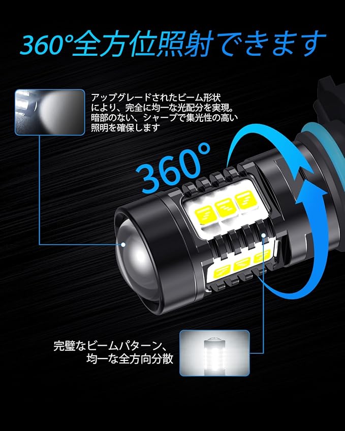 【最適化された光配布】H11 H8 H9 LEDフォグライトバルブは凸レンズと360 照明を採用し、霧・雨・雪や夜間条件下でも優れた視認性と広い照射範囲を実現。暗部やムラのある影、対向車へのグレア発生もありません。対向車両を眩惑させずに視認性を高める、均整の取れたビームを実現