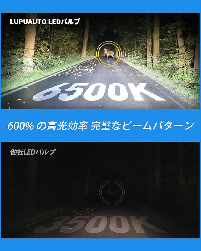 【視認性と明るさの向上】lupuauto 9006/HB4 LEDフォグライトバルブは先進的なCSP LEDチップを採用し、6500Kのクリアな白色光を放ち、視認性を最大500%向上させます。優れた道路照明効果により、かすんだ車線から遠方の障害物まであらゆる細部を明瞭に照らし出し、反応速度を高め、夜間運転をより安全にします。特に霧・雨・雪などの悪天候時において、より安全で明るい走行体験を提供。