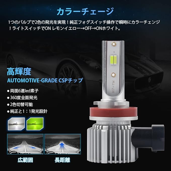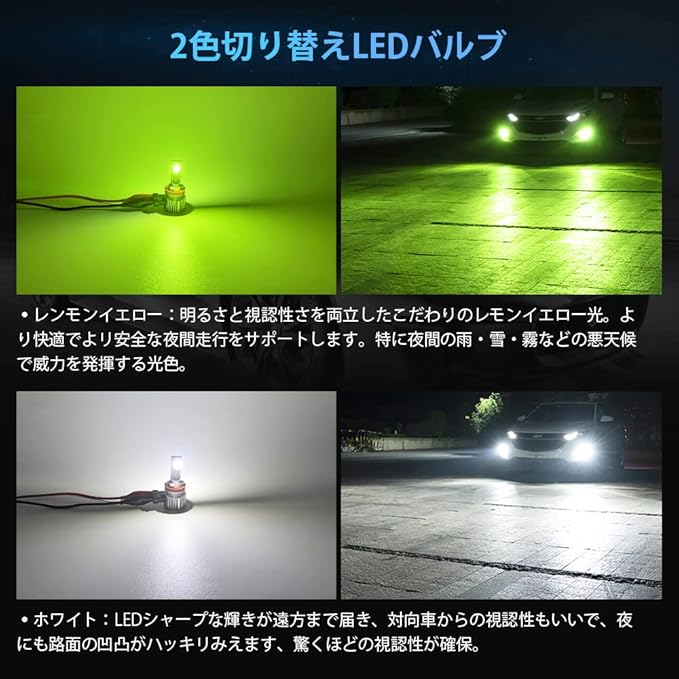 【カラーチェージ可能】1つのバルブで2色の発光を実現!純正フォグスイッチ操作で瞬時にカラーチェンジ!ライトスイッチでON レモンイエロー(黄緑)→OFF→ONホワイト(白)→OFF→ONレモンイエロー(黄緑)。刻々と変化する路面の状況に応じて即座に順応する驚きの2色切り替え機能をぜひご体感ください。