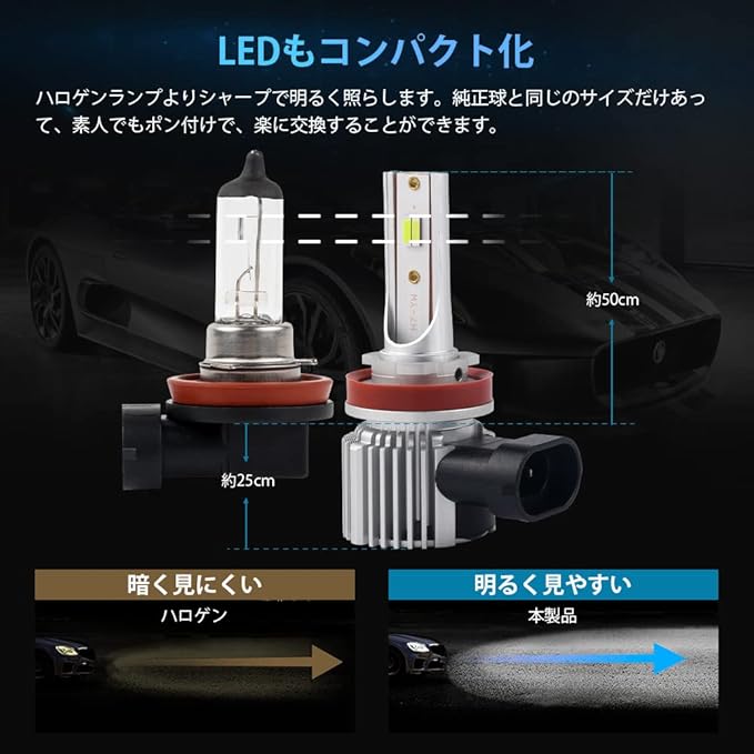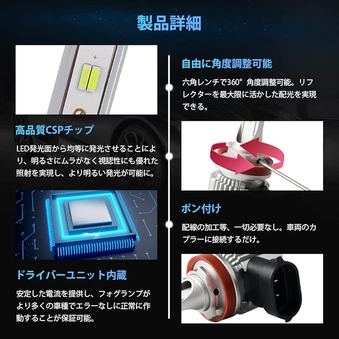 【ドライバーユニット内蔵】ドライバーユニット内蔵され、コンパクト化も実現。そして、安定した電流を提供し、フォグランプがより多くの車種でエラーなしに正常に作動することが保証可能。※1、本製品は汎用品となりますので、全ての車種において適合するものでは御座いません。必ず本製品のサイズをご確認の上お買い求めください。2、製品は極性があります。ライトが点灯しない場合は、向きを変えてください。