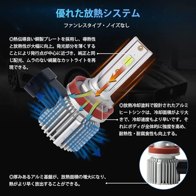 【優れた耐久性】高温にも耐えられ、耐熱性・放熱性に優れたアルミニウム合金と銅製プレートを採用。アルミヒートシンク設計により、放熱面積が最大限度に増やされ、放熱性能が大幅にアップ。熱ダレによる明るさの減少を抑制することに成功。