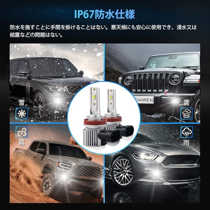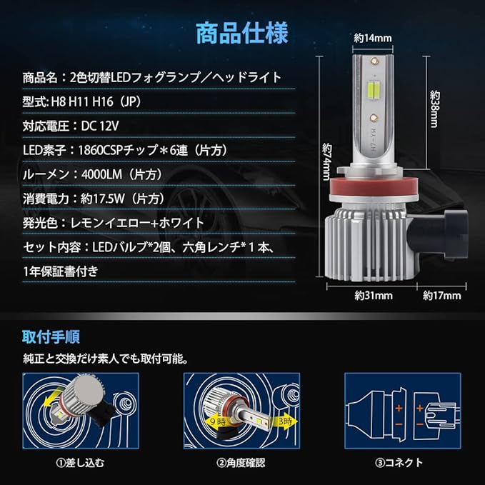 【ポン付け】一体型の設計で複雑なコネクタや配線は一切ありません。純正との交換は差し込むだけで完了です。ファンレス設計で、ノイズへの心配も要りません。製品名:LEDフォグランプ/ヘッドライト、型式:H8 H11 H16(JP)、対応電圧:約17.5W(片方)、入力電圧:DC9V-30V、ルーメン:4000LM(片方)、LED素子:1860CSPチップ、防水規格:IP67、保証期間:お買い上げ日より1年保証。