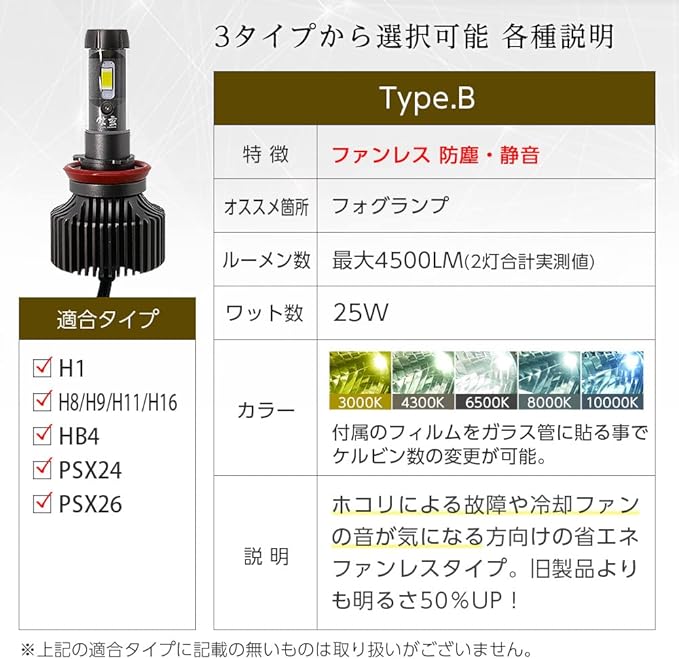 製品情報:LEDバルブ H8/H9/H11/H16(兼用) 【仕様】12V/24V兼用 【ルーメン数】2灯合計4500lm(車検の合格基準の明るさ)【消費電力】25W 【選べるケルビン数】3000K、4300K、6500K、8000K、10000K(付属のフィルムで5色にカラー変更可)【ファン】ファンレス※保証はご購入日から3ヶ月間となります。