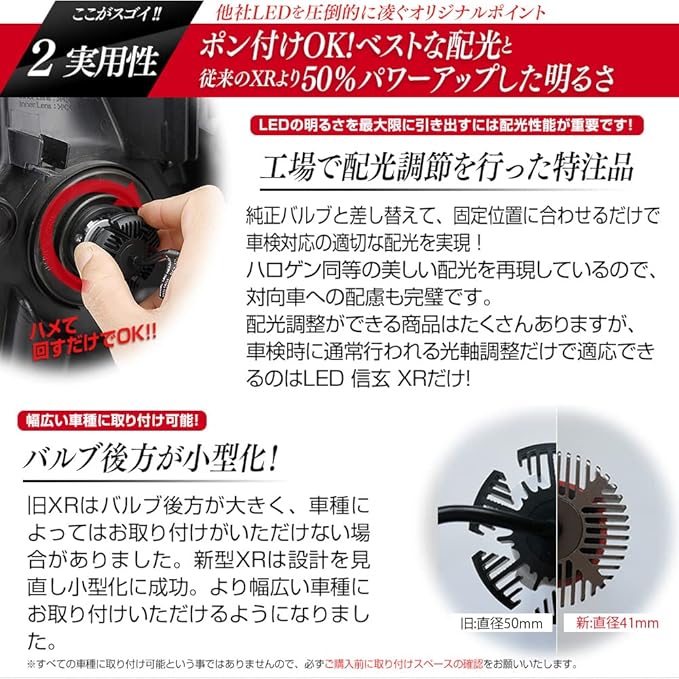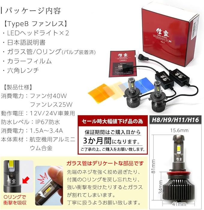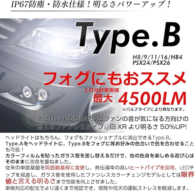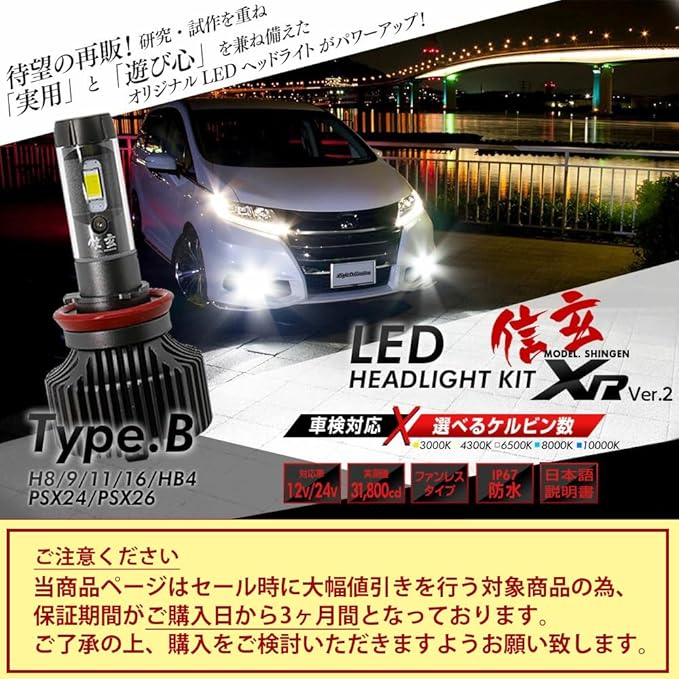 【ledヘッドライト フォグランプ 信玄 XR Ver2 改良版 明るさ 光軸 車検 取り付け易さ 希望の色 全てを兼ね備えたモデル誕生】 純正バルブと差し替えて固定位置に合わせるだけで車検対応の便利性はそのままに、ケルビン数のフィルムの種類も増え、明るさも従来より30%アップ。最大8000LM・驚異の31800cd!(4300K/6500Kは車検の合格基準の明るさ)マイナスコントロール車対応、無極性バルブで簡単取付。5種類から選べるケルビン数【TypeAファンレス・TypeBファン付き】とカラーチェンジ【TypeCC】の豊富なラインナップ!■ハイパワーファン付 【TypeA】H1 H4 H7 H8 H9 H11 H16 H19 HB3 HB4 HIR2■防塵に強いファンレス 【TypeB】H1 H8 H9 H11 H16 HB4 PSX24 PSX26■スイッチで切替可能カラーチェンジ 【TypeCC】H8 H9 H11 H16 HB4 PSX24 PSX26※車種により取付ス ペースが狭い為装着が出来ない場合もあります。ご購入前に必ずバルブ後方スペース等の確認をお願い致します。
