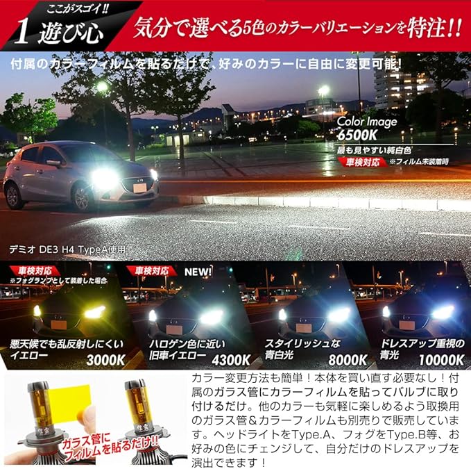【気分で選べる5色のカラーバリエーション】ガラス管に付属のカラーフィルムを貼るだけで、好みのカラーに自由に変更可能。改良版には4300Kフィルムが追加されました。3000K、4300K、6500K、8000K、10000Kと、実用からドレスアップまで楽しめるキットです。ファッション性をアップで他の車と差を付けられること間違いなし!