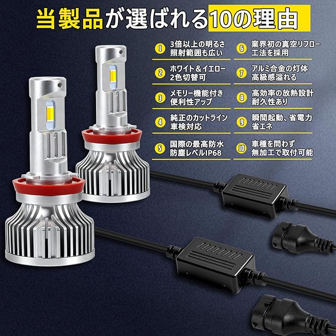 【H11 LED 爆光 & 配光抜群】当LEDは高輝度LEDチップと最適化された配光設計により、純正比300%以上の明るさで明確なカットラインと均一で広範囲な光配布を実現。暗部を抑え路面照明を向上させるとともに、対向車への眩しさも効果的に回避されます。また、角度調整機能を備えており、ご愛車に合わせて、最適な配光に微調整が可能です。瞬時点灯技術により通電後即座に最大輝度に達し、応答遅延はありません。消費電力は純正ハロゲンのわずか1/2であり、高い照明効率と大幅な省エネルギーを両立しています。