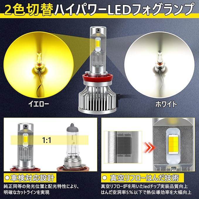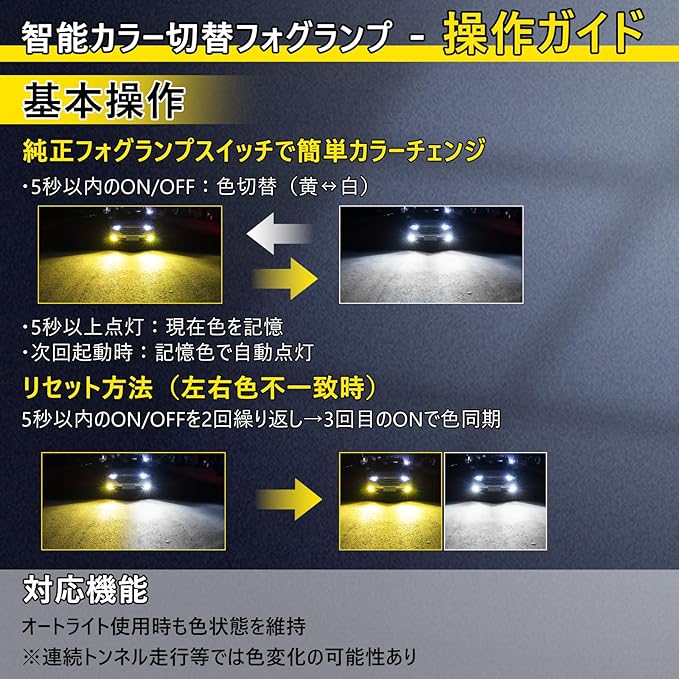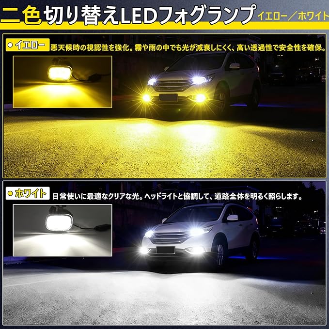 【H16 LED 2色切替 メモリー機能つき】形状:H16/H11/H9/H8、発光色:イエロー(3000K)/ホワイト(6500K)。6500Kの白色と3000Kの黄色をワンタッチで切り替えられ、ホワイトは晴れた日は視界を明るく、イエローは霧や雨の日も高い透過性を発揮します。さらに、前回の使用色を自動で記憶する機能で、次回の点灯時も設定不要で便利にご利用いただけます。