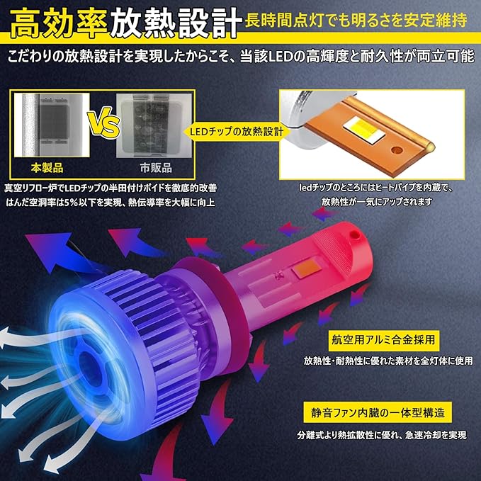 【業界初の真空リフロー技術、超長寿命を実現】真空リフローはんだ付け技術により、ledチップのはんだ空洞率を5%以下に抑制。チップと基板の強固な接合と効率的な熱伝導を実現し、長寿命と信頼性の基盤を確立しました。一体型のアルミ合金ボディと静音ファン内臓の高効率放熱構造による急速冷却に加え、内蔵温度センサーによる過熱防止、およびアルマイト絶縁処理による短絡リスク排除により、多重の保護システムを構築し、超長寿命を確保できます。