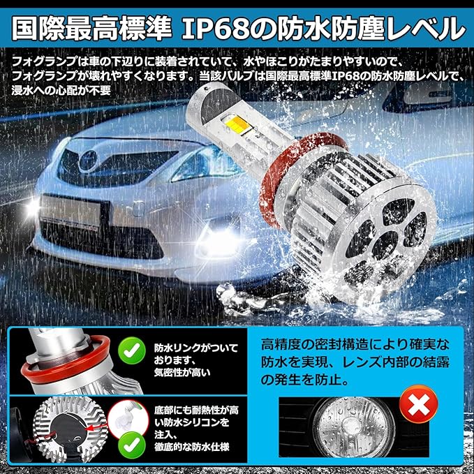 【H16/H11/H9/H8 LED IP68防水防塵&取付簡単】当該LEDフォグは最高レベルのIP68保護等級を取得し、厳密な防塵・防水性能を備えています。豪雨の衝撃や路面からの水跳ね、粉塵の侵入に強く、過酷な天候や複雑な路況下でも照明が安定し、長期的な信頼性を確保します。また、純正ハロゲンと同形状&同アダプターで配線改造や追加作業は一切不要で、初心者でも簡単に取り付けられます。まさに「交換するだけで使える」手軽なアップグレードを実現。