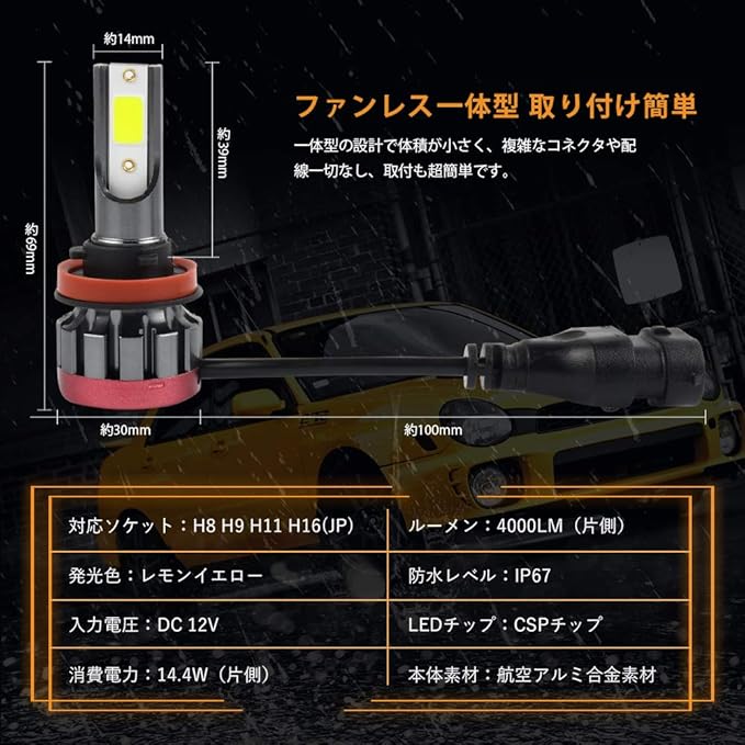 ◆【製品仕様】対応ソケット:H8 H9 H11 H16(国産車)、消費電力:14.4W(片側)、入力電圧:DC 9V-22V、ルーメン:4000LM(片側)、発光色:レモンイエロー、チップ採用:COBチップ搭載、本体素材:航空用6063アルミ素材、防水等級:IP67(雨の日も安心します)。