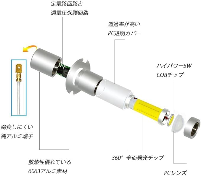 ●【360 全面発光LEDランプ】360 全面発光COBチップを採用し、ムラなく無死角照射する。正面にドーム型広拡散強化プロジェクターPCレンズを使用し、透光性と集光性は大幅アップ、ムラなく照射と輝度の向上を実現。安全性がアップします。