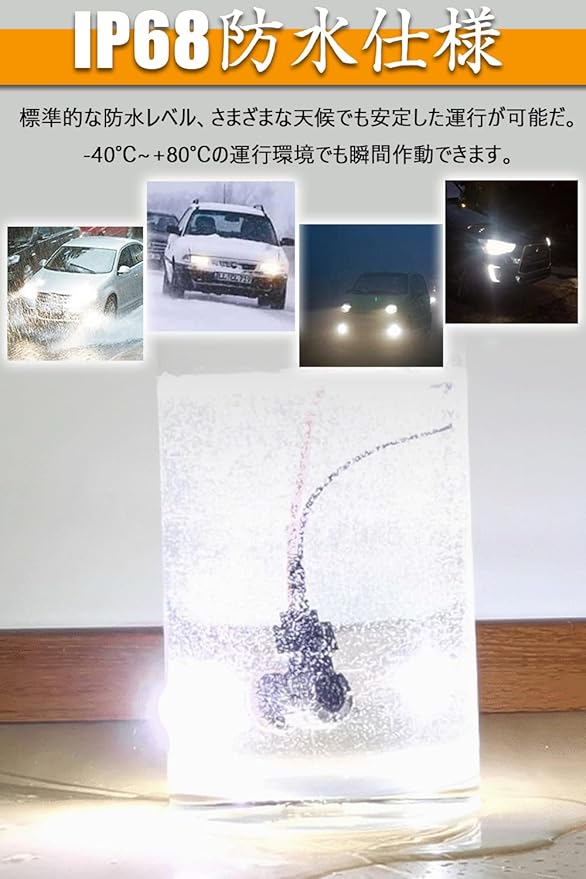 IP68防水レベルと取付簡単:国際標準IP68防水レベルで、雨や雪の日も心配なし。安全運転を確保し、運転者にもっと安全です。無極性タイプ、一体型の設計で体積が小さく、複雑なコネクタや配線一切無し。取り付けは純正バルブを取り外し、本製品を付けるだけ超簡単です。