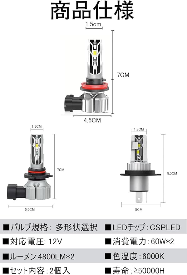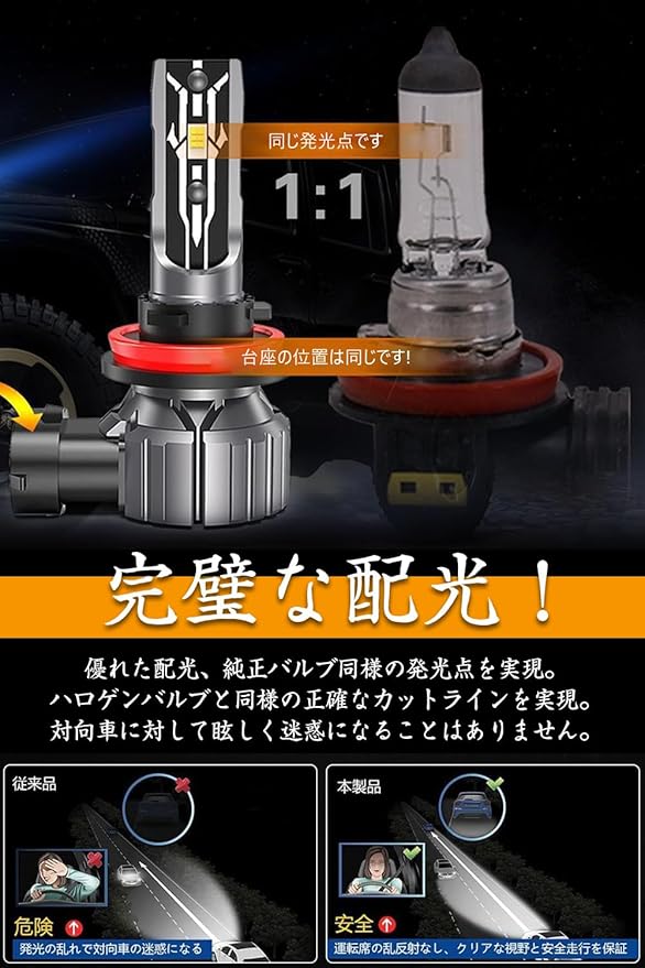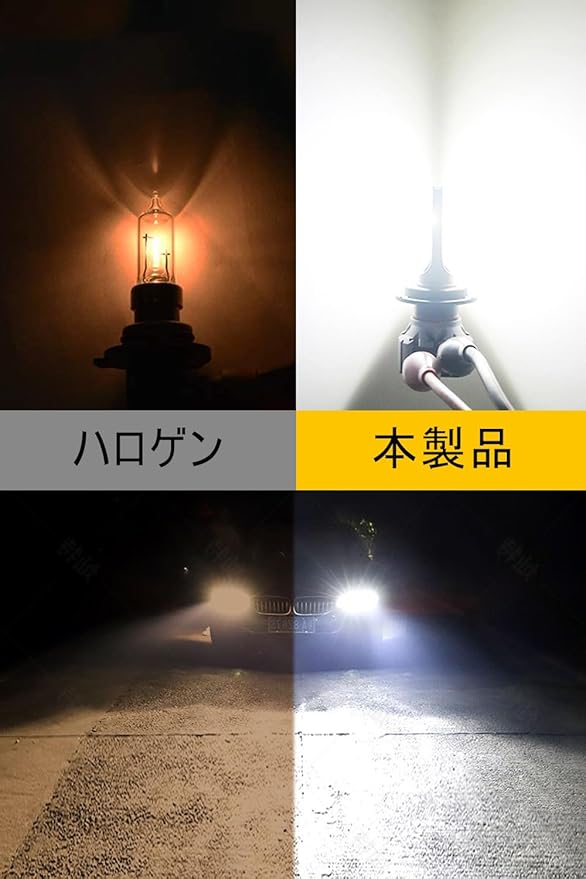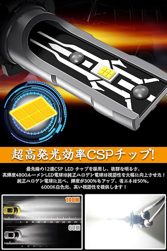 高輝度:このhb4 ledフォグランプは両面抜群の視認性高品質CSPチップ搭載採用して、ハロゲンより50%省エネなのに300%明るさUP!超輝度で、ハロゲンより大幅に視認性を高めています。大雨の中屋道の悪い路面を走行しても高い耐久性を発揮し永くご愛用していただきます。特に夜間の雨 雪 霧などの悪天候で威力を発揮する光色。