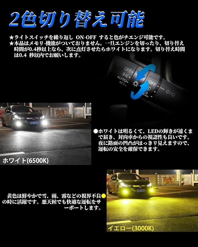 【高輝度CSPチップ搭載&2色切り替え可能】高輝度 高品質なCSP1860チップ採用、均一 高効率の発光特徵を持って、発光率が大幅にアップ! ホワイトは6000K、イエローは3000K!スイッチのON/OFFを繰り返すと色を変わります。夜間のドライ路面では明るく・ファッショナブルな光を発するホワイト光(6000K)。悪天候のウェット路面では視認性の高いイエロー光(3000K)。